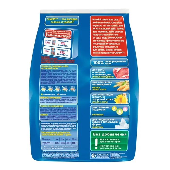 Полнорационный сухой корм для взрослых собак всех пород. Новое вкусное меню от Чаппи станет любимой едой вашей собаки. Выбирая полноценное сбалансированное питание Чаппи для Вашего любимца, вы можете быть уверены в том, что каждый день ваша собака будет довольной, игривой и здоровой.