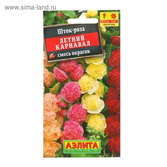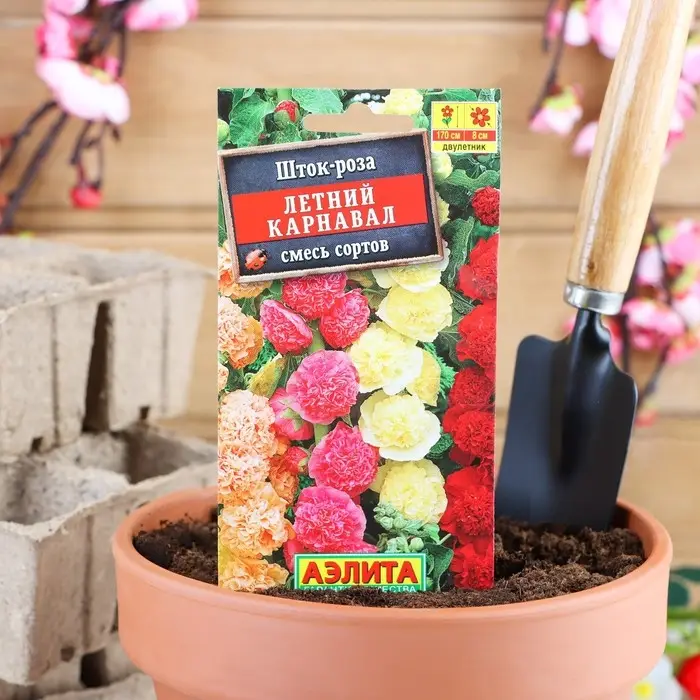 «Летний карнавал» — неприхотливое высокорослое растение с крупными махровыми цветками. Шток-розы светолюбивые, засухоустойчивые, не любят застоя воды в почве. Подходят для срезки, в воде раскрывают все бутоны.