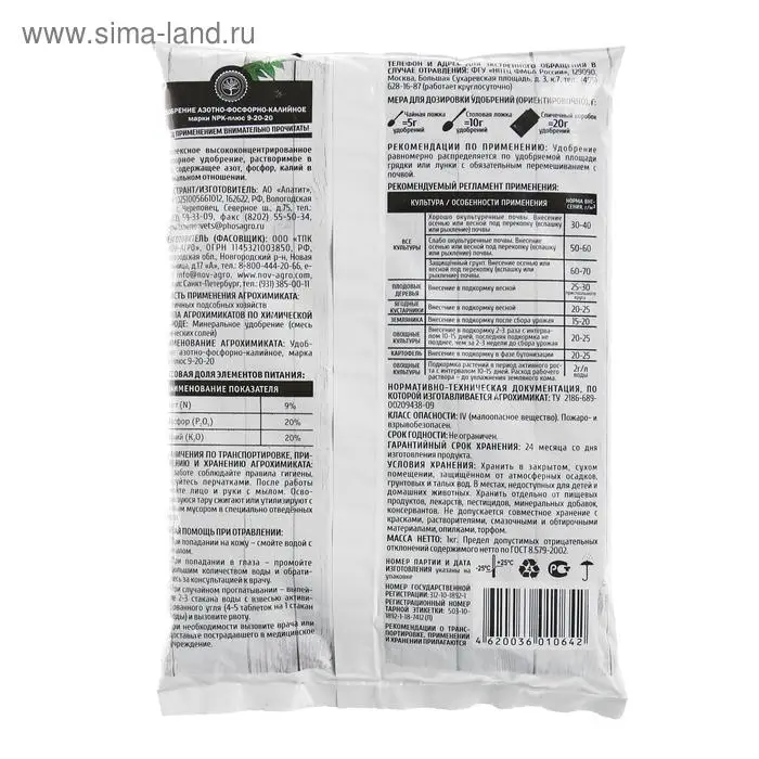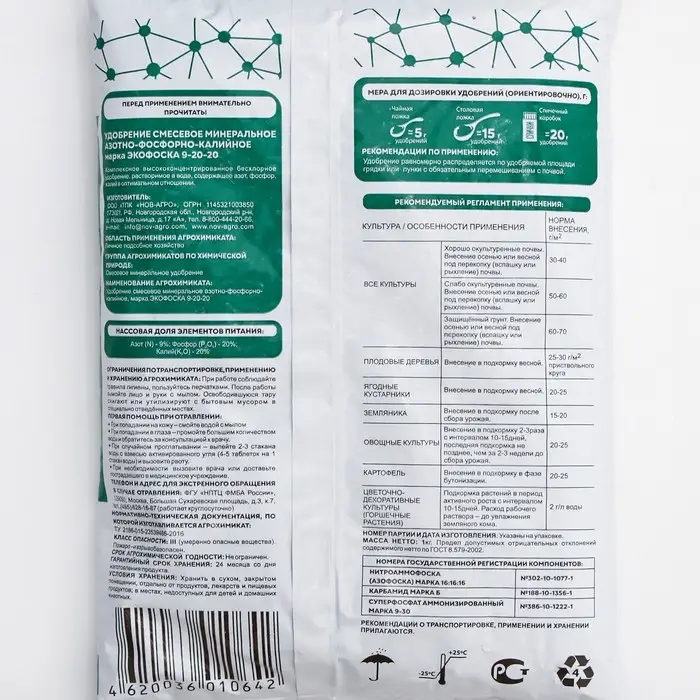 Состав: N-9%, P2O5 – 20%, K2O – 20%.