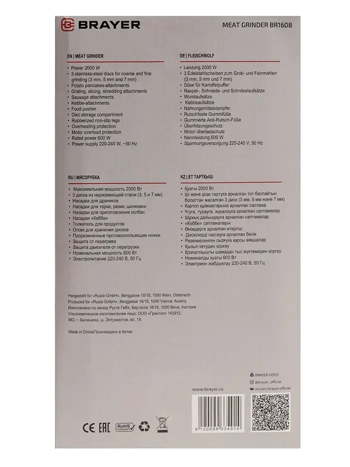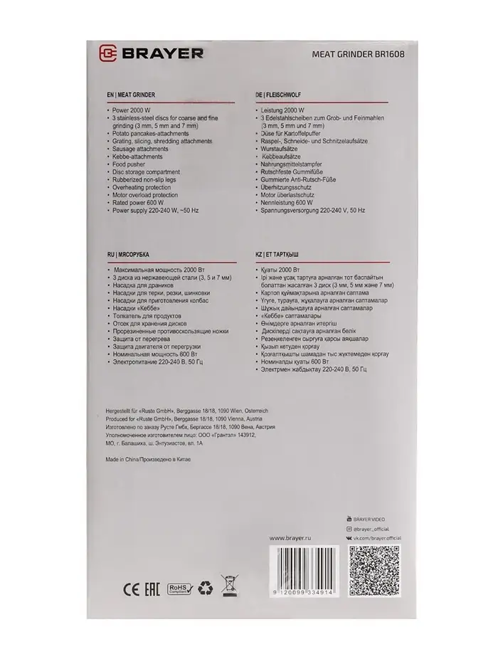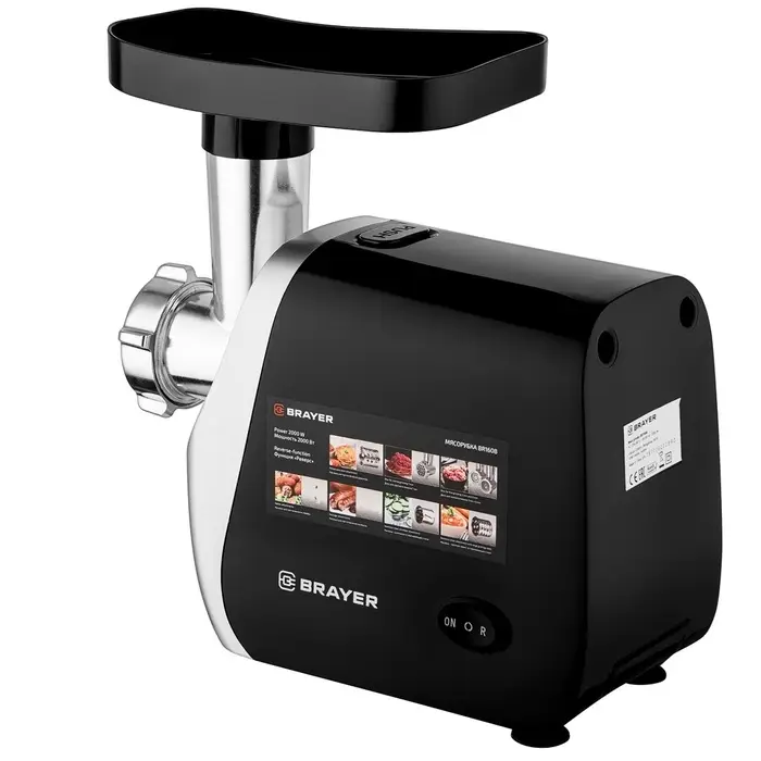 Мясорубка BRAYER 1608BR, электрическая, 2000 Вт, реверс, 3 диска, 4 насадки, 2 кг/мин