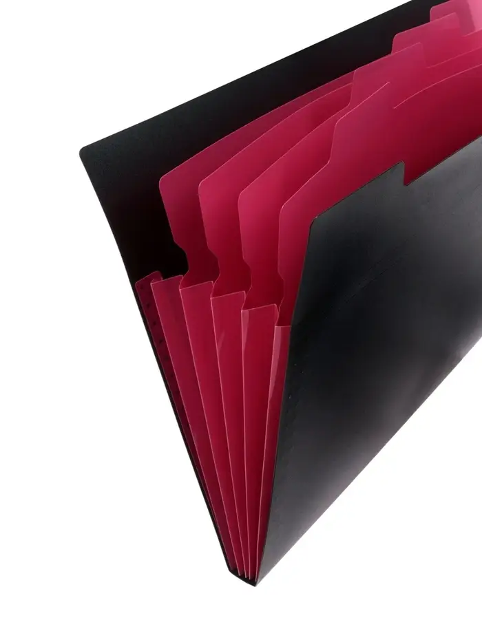 Папка пластиковая на кнопке с отделениями Calligrata формата А4. Обложка матовая, фактура «песок». Цвет обложки - черный. Пять внутренних отделений для удобного хранения и организации документов. Каждое отделение с индексным полем, позволяет сортировать документы по темам или алфавиту. Надежная застежка-кнопка. Контрастный красный цвет отделений. Быстрый доступ к содержимому. Изготовлена из высококачественного полипропилена с матовой текстурой. Предназначена для хранения и транспортировки документов. Толщина обложки 600мкм. Вмещает до 200 листов. Размер 245*325*10. Упакована в индивидуальный прозрачный пакет по форме.