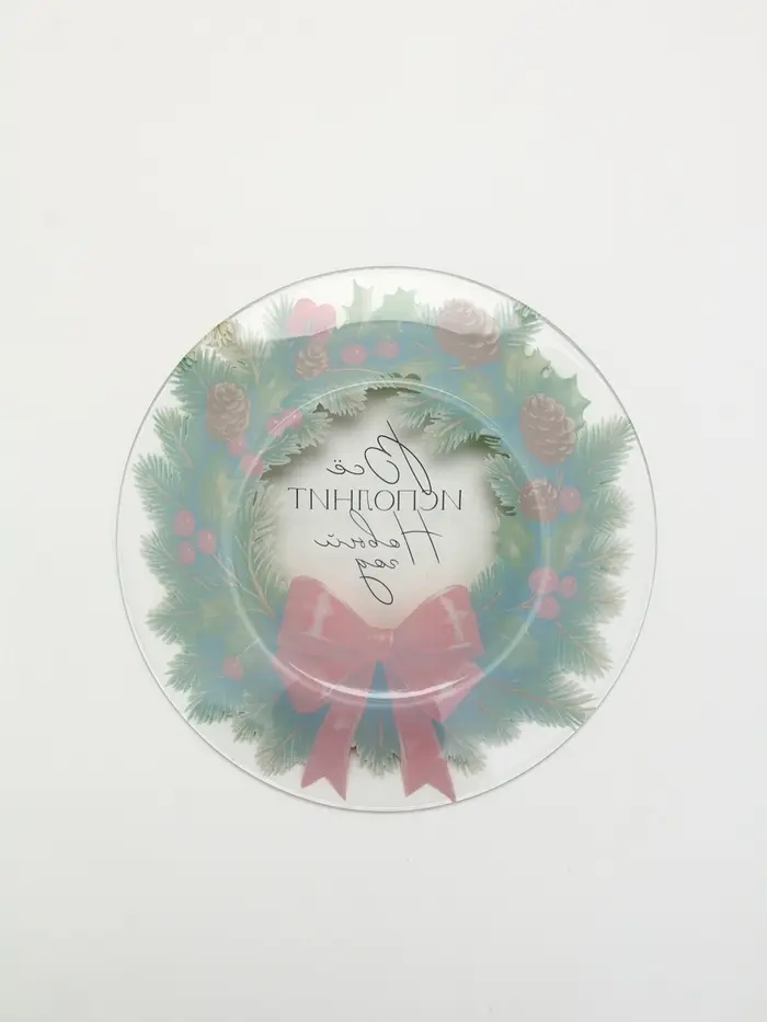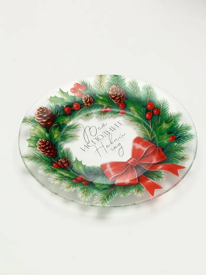 Новогодняя стеклянная тарелка «Венок на Новый год» — идеальный выбор для сервировки стола.