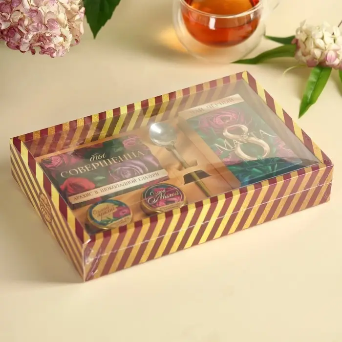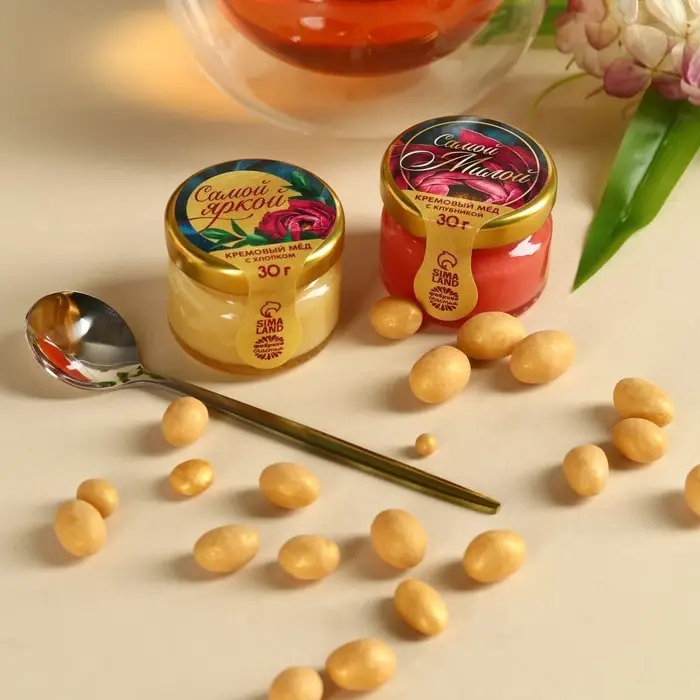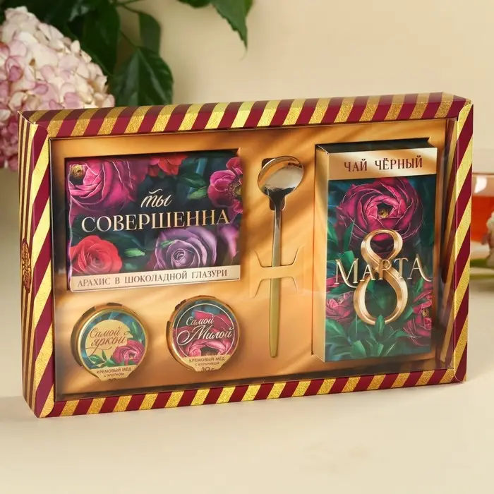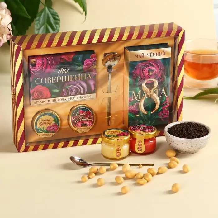 Набор «Ты совершенна»: крем-мёд с клубникой и хлопком 30 г. х 2 шт., арахис в шоколадной глазури 70 г., чай чёрный с тропическими фруктами 50 г., ложка