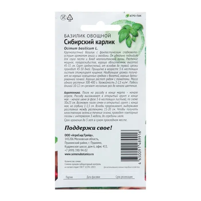 БАЗИЛИКСибирский карликOcimum basilicum L.Крупнолистный базилик с фантастическим сладковато-острым ароматом аниса и гвоздики. Он идеально подходитдля соуса песто и блюд неаполитанской кухни. Растениемощное, полураскидистое, хорошо облиственное, высотой45-55 см. Сорт среднеспелый, от всходов до первой срезкипроходит 45-50 дней. Прищипка в возрасте 5-6 настоящихлистьев стимулирует кущение. Наибольшие урожаи получа-ют на хорошо освещенных грядках с богатой, хорошо дрени-рованной почвой. Хорошо растет рядом с томатами. Массаодного растения 300-400 г. Урожайность 2-2,3 кг/м2. Побегидлиной 10-12 см срезают несколько раз до начала цветения.Агротехника. Посев на рассаду в конце марта – началеапреля. Рассаду высаживают в открытый грунт в концемая – начале июня (в фазе 5-6 настоящих листьев), по схеме30х25 см. Возможен посев семян в открытый грунт с концамая, на глубину 1-1,5 см. Всходы прореживают, выдерживаярасстояние между растениями 15-20 см. Чтобы получатькачественную зелень в течение сезона, проводят повторныепосевы с интервалом 3 недели, до середины июля.Срок хранения до 5 лет в сухом прохладном месте.Поддержи свое!