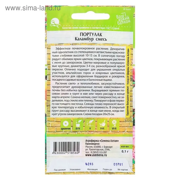 Эффектное почвопокровное растение. Декоративный однолетник со стелющимися ветвистыми красноватыми стеблями высотой 10-15 см. В солнечную погоду радует обилием ярких цветков, покрывающих растение с июня до заморозков. Цветки махровые и полумахровые крупные, диаметром 3-4 см, разнообразной яркой окраски. Отлично подходит для украшения открытых участков, альпийских горок и ковровых цветников, используется для оформления бордюров и рокариев, посадки в садовые вазоны и балконные ящики. Растение свето- и теплолюбивое, засухоустойчивое, предпочитает дренированные легкие известкованные почвы без избытка органики.