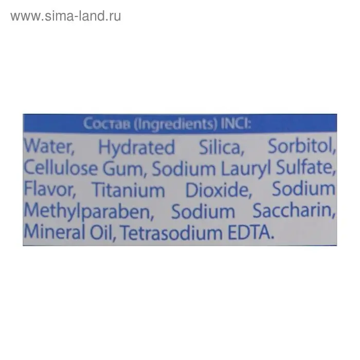 Состав: Aqua (Water), Hydrated Silica, Sorbitol, Cellulose Gum, Sodium Lauryl Sulfate, Parfum (Flavor), Titanium Dioxide, Sodium Methylparaben, Sodium Saccharin, Mineral Oil, Tetrasodium EDTA.