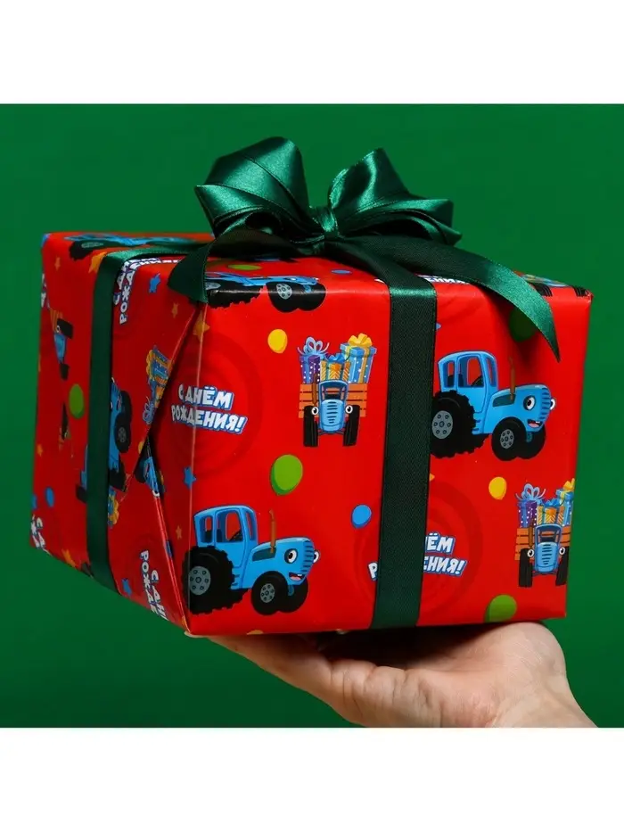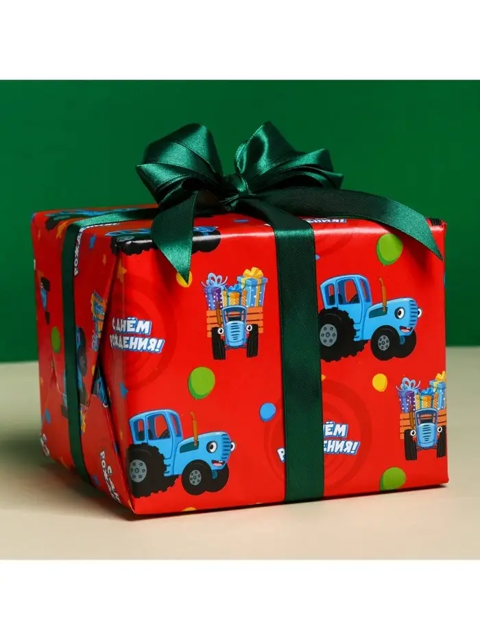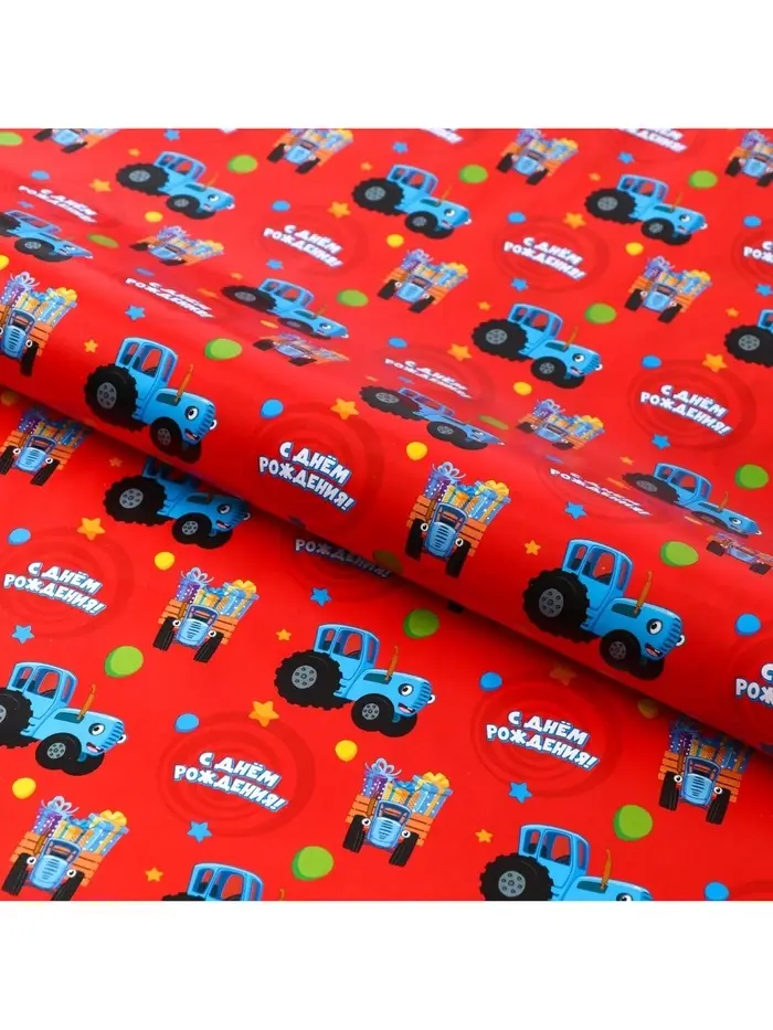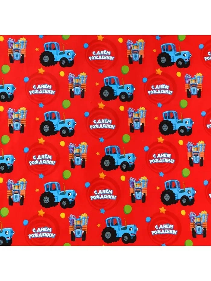 Бумага упаковочная глянцевая, «С днём Рождения», Синий трактор, 70х100 см