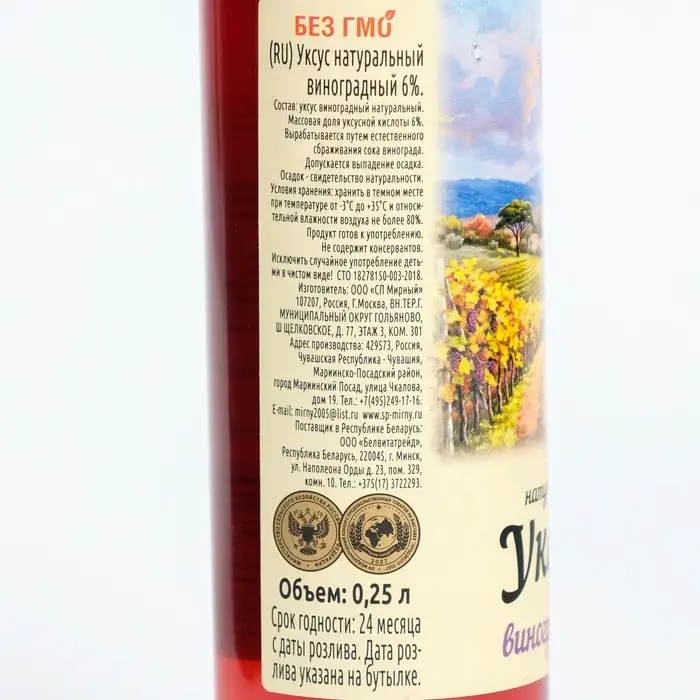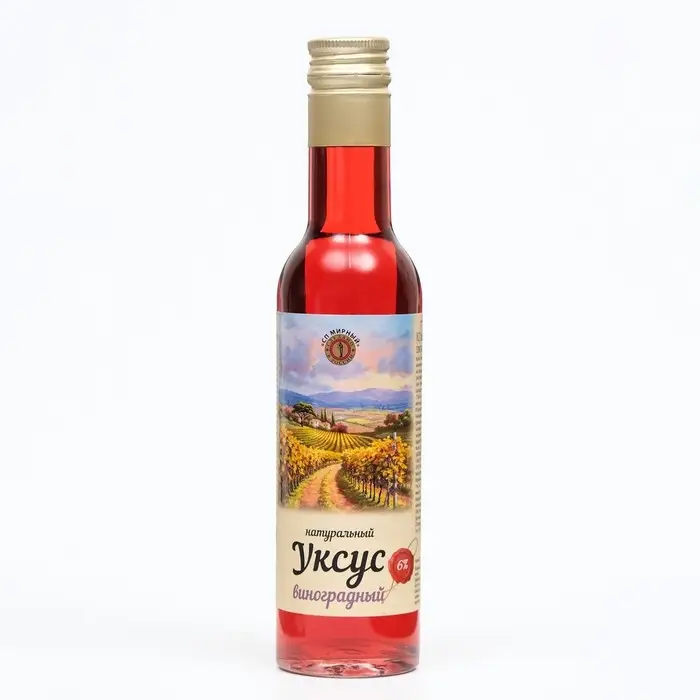 Состав: уксус виноградный натуральный. Массовая доля уксусной кислоты 6%. Вырабатывается путем естественного сбраживания сока винограда. Допускается выпадение осадка. Осадок - свидетельство натуральности.