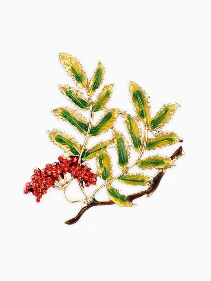 Брошь "Ветка Рябины", цвет красно-зелёный в золоте