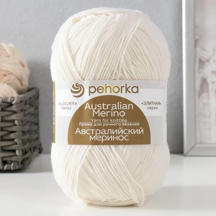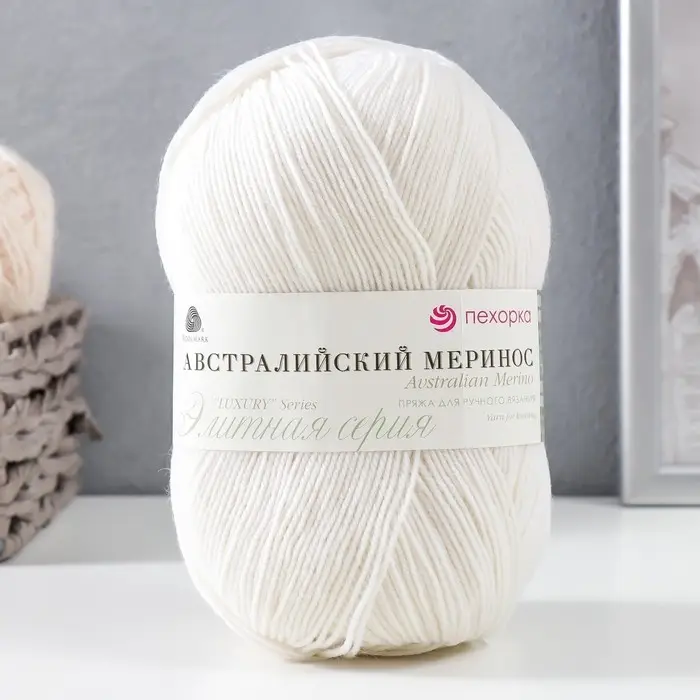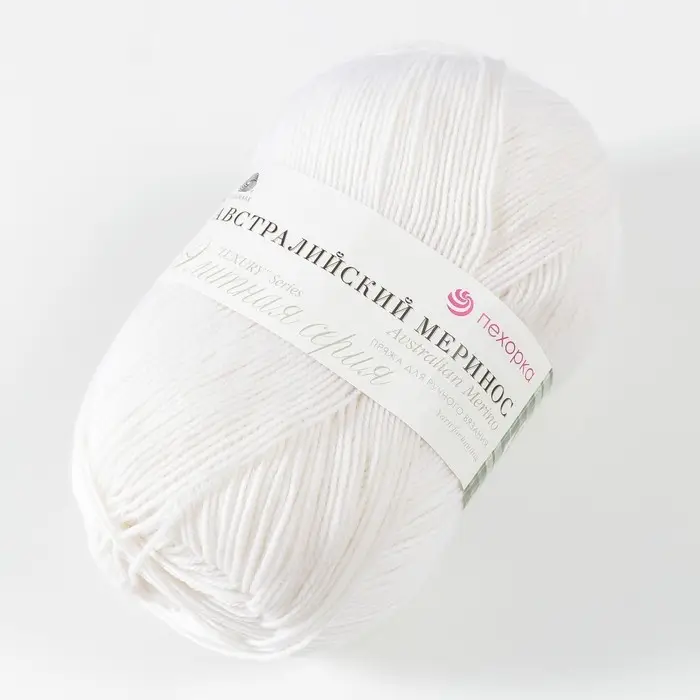 Пехорская пряжа для вязания спицами, крючком «Пехорский текстиль. Австралийский меринос», 95% мериносовая шерсть, 5% акрил объёмный 400 м/100 г, (01 белый) элитной серии поистине таковой и является. Мериносовая шерсть с добавлением высокоусадочного акрила, создаёт объём, а повышенная крутка нитей предаёт ей эффектный внешний вид. Рукодельницы ценят эту изысканную пряжу, ведь получается красивый ровный узор, аккуратное полотно. Свяжите термобельё и вы убедитесь в том, как тепло вам будет даже в самые лютые морозы.