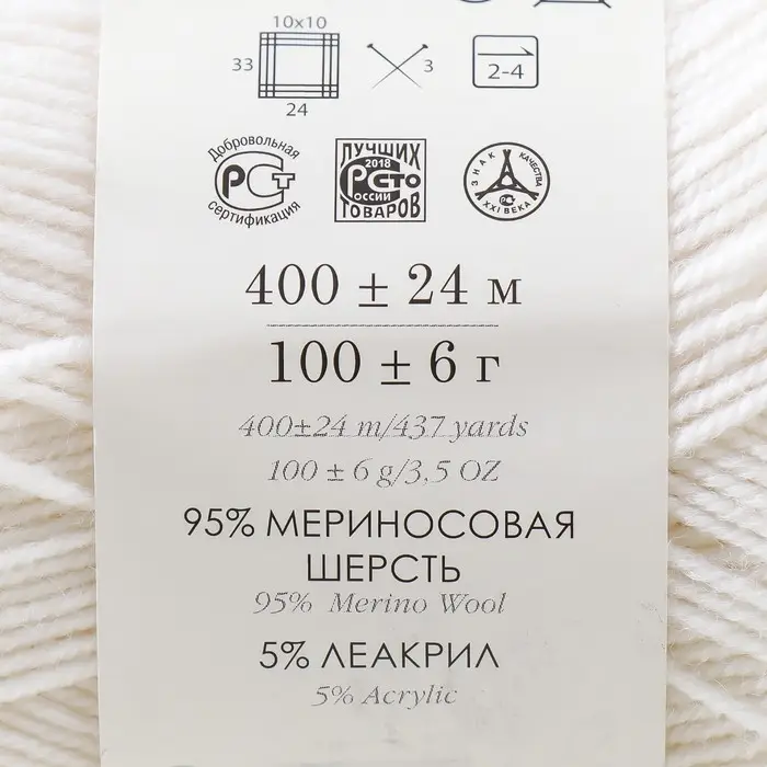 Пряжа для вязания спицами, крючком «Пехорский текстиль. Австралийский меринос», 95% мериносовая шерсть, 5% акрил объёмный 400 м/100 г, (01 белый)
