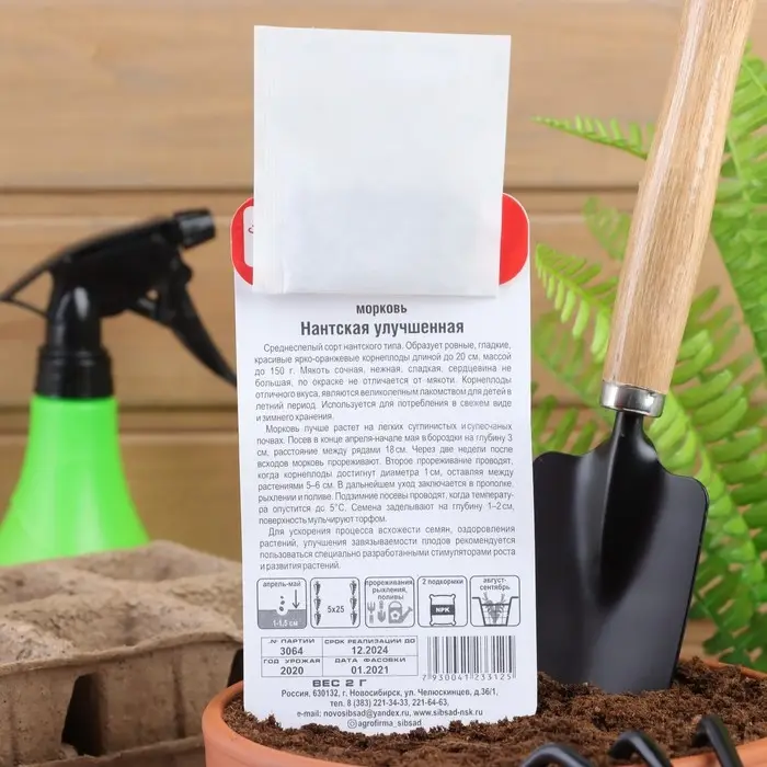 Среднеспелый сорт нантского типа. Образует ровные, гладкие, ярко-оранжевые корнеплоды длиной до 20 см, массой до 150 г. Мякоть сочная, нежная, сладкая, сердцевина небольшая, по окраске не отличается от мякоти. Корнеплоды отличного вкуса, являются великолепным лакомством для детей в летний период. Используется для потребления в свежем виде и зимнего хранения. Морковь лучше растет на легких суглинистых и супесчаных почвах. Посев в конце апреля- начале мая на глубину 3 см, расстояние между рядами 18 см. Через две недели после всходов морковь прореживают. Второе прорежевание производят, когда корнеплоды достигнут диаметра 1 см, оставляя между растениями 5-6 см. В дальнейшем уход заключается в прополке, рыхлении и поливе. Подзимние посевы производят, когда температура опустится до 5 С. Семена заделывают на глубину 1-2 см, поверхность мульчируют торфом. Для ускорения процесса всхожести семян, оздоровления растений, улучшения завязываемости плодов рекомендуется пользоваться специально разработанными стимуляторами роста и развития растений.