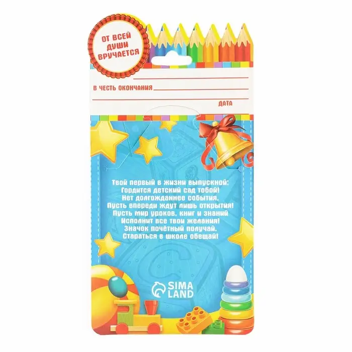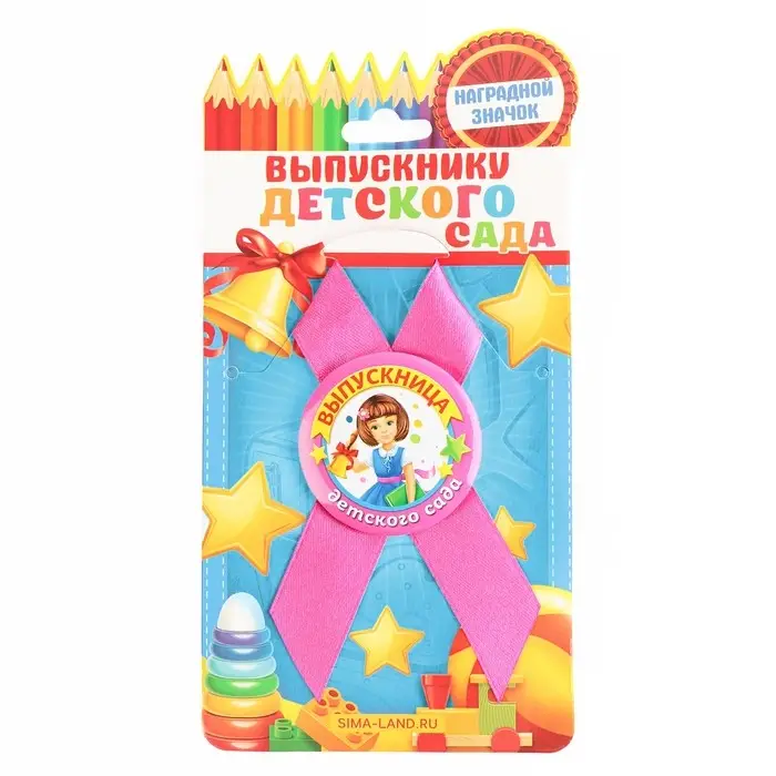 Выпускной - это особое событие для каждого ребёнка. Сувенир изготовлен из лёгкого пластика и декорирован яркой текстильной лентой шириной 1,8 см. Изделие дополнено булавкой на оборотной стороне, так что его сразу можно надеть на счастливого получателя. Каждый значок на булавке с лентой прикреплен к яркой, нарядной подложке - открытке, ребенку будет вдвойне приятно получить такой презент