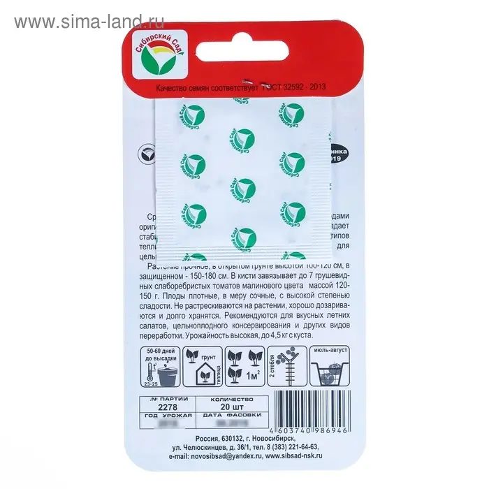 Среднеранний (105-110 дней от всходов) сорт с плодами оригинальной формы и яркой малиновой окраской. Обладает стабильно высокой урожайностью. Подходит для всех типов теплиц и открытого грунта. Один из лучших сортов для цельноплодного консервания. Растение прочное, в открытом грунте высотой 100-120 см, в защищенном - 150-180 см. В кисти завязывает до 7 грушевидных слаборебристых томатов малинового цвета массой 120-150 г. Плоды плотные, в меру сочные, с высокой степенью сладости. Не растрескиваются на растении, хорошо дозариваются и долго хранятся. Рекомендуются для вкусных летних салатов, цельноплодного консервирования и других видов переработки. Урожайность высокая до 4,5 кг с куста.