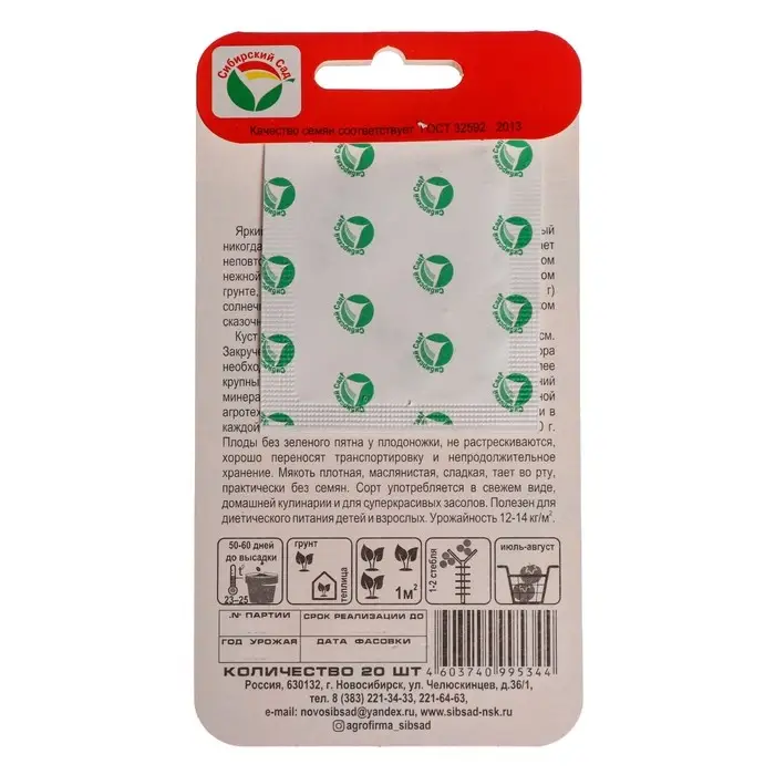 Куст слаборазвитый, слабооблиственный, высотой до 180см. Закрученный лист - характерная особенность сорта. Для набора необходимой вегетативной массы зелени и получения более крупных плодов желательны регульные подкормки растений минеральными и органическими удобрениями. При правильной агротехнике растение завязывает до 6 кистей с 6-8 плодами в каждой. Средняя масса плодов 180г, максимальная до 400г. Плоды без зеленого пятна у плодоножки, не растрескивааются, хорошо переносят транспортировку и не продолжительное хранение. Мякоть плотная, маслянистая, сладкая, тает во рту, практически без семян. Сорт употребляется в свежем виде, домашней кулинарии и для суперкрасивых засолов. Полезен для диетического питания деней и взрослых. Урохайность 12-14 кг с квадратного метра.