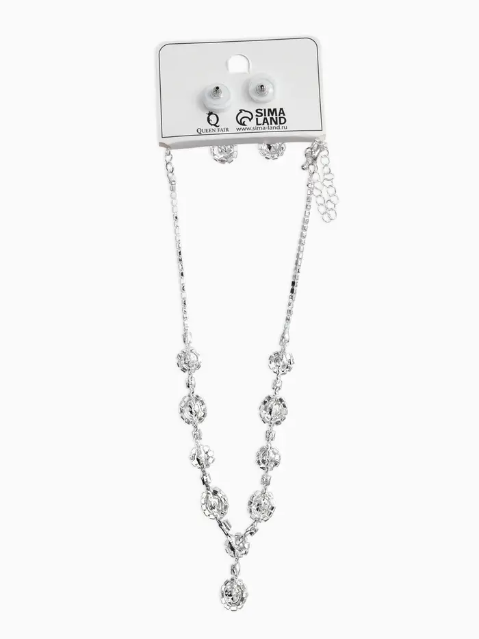 Набор 2 предмета: серьги, колье, цветок, белый в серебре, 45 см
