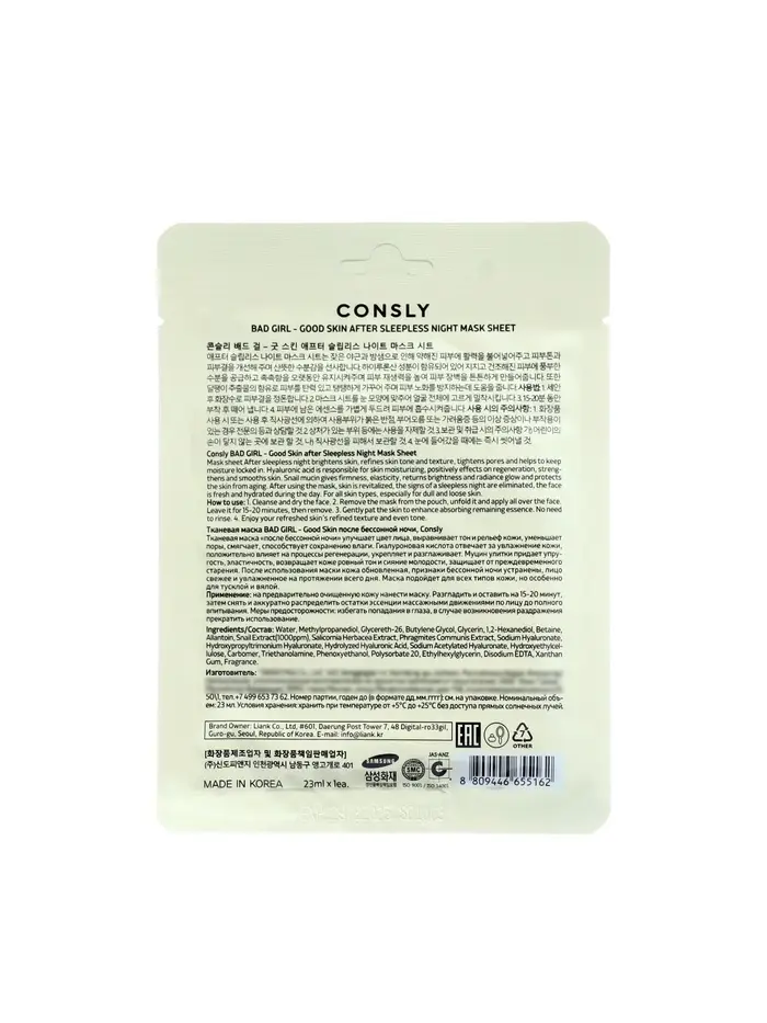 Маска тканевая для лица Consly «После бессоной ночи», 23 мл