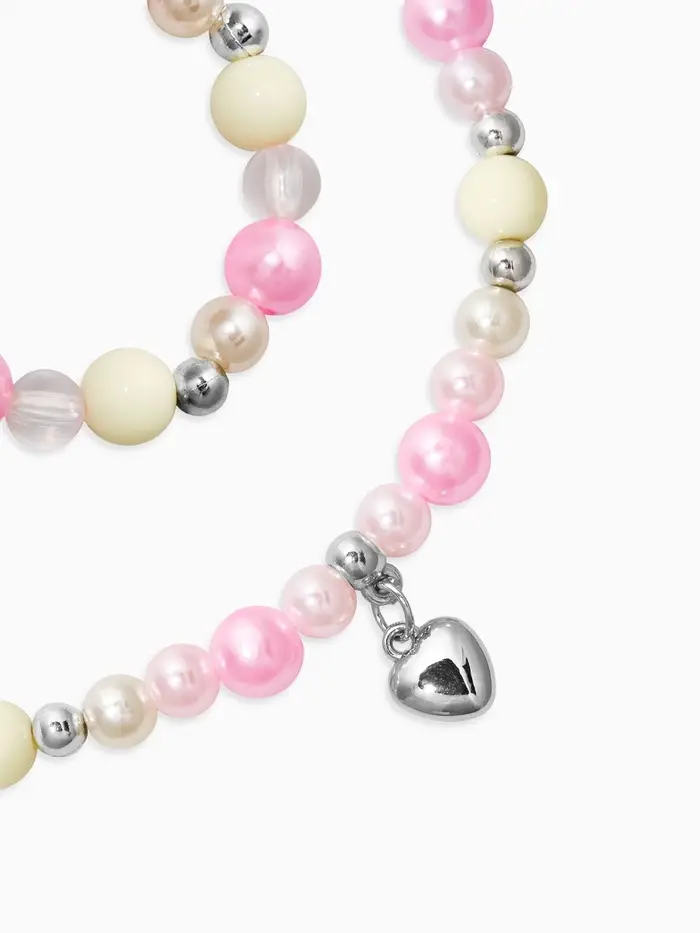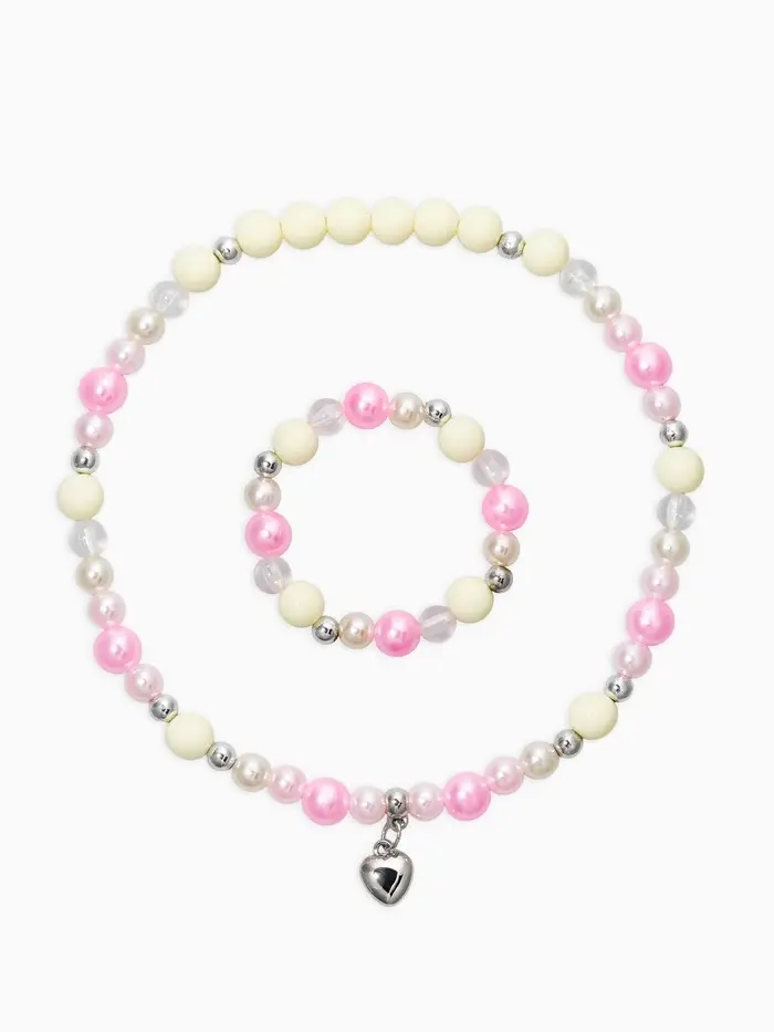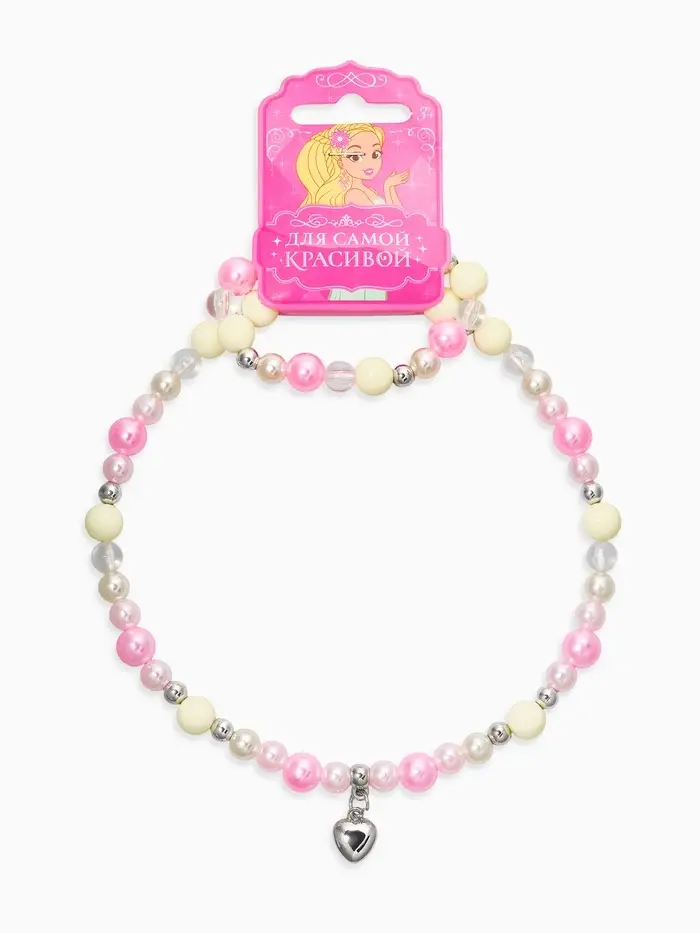Набор детский «Выбражулька» 2 предмета: бусы, браслет d=6 см. сердце, розовый в серебре