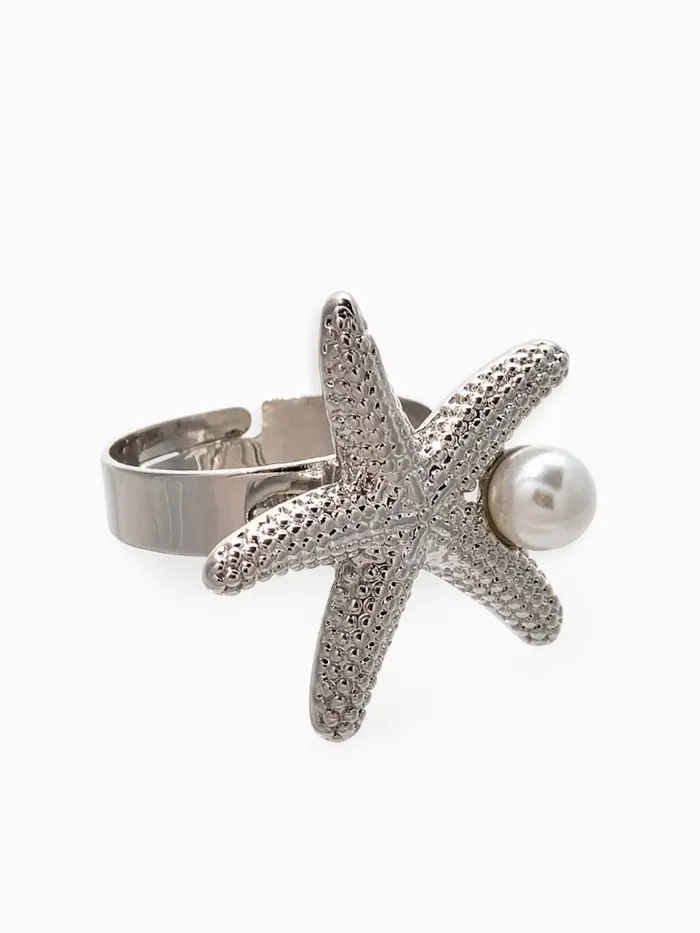 Кольцо "Морская звезда" с бусиной, безразмерное, цвет белый в серебре