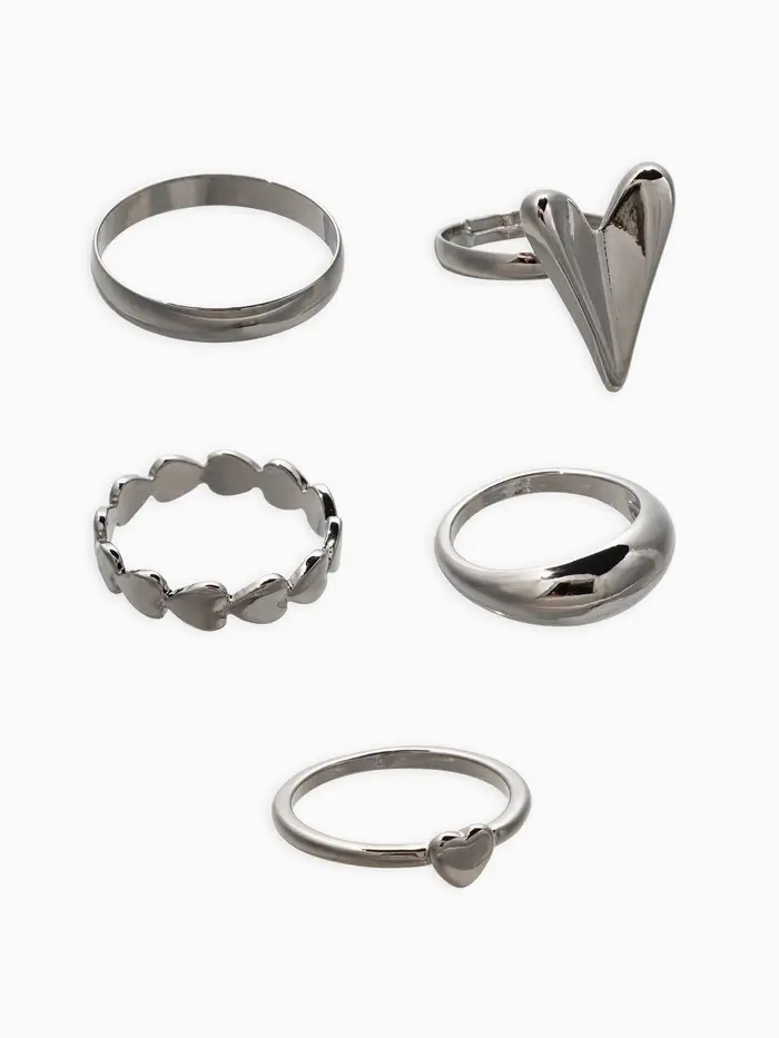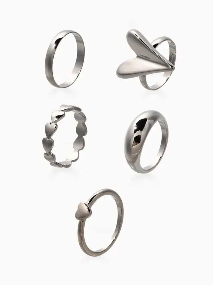Набор колец 5 шт "Новый стиль" сердечки, размер МИКС, цвет серебро