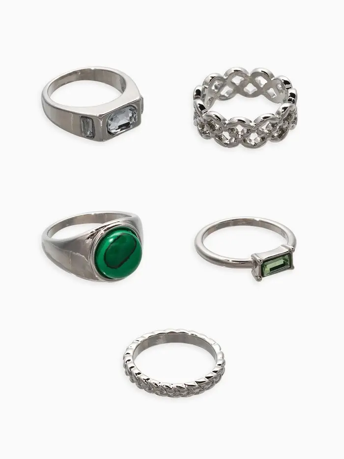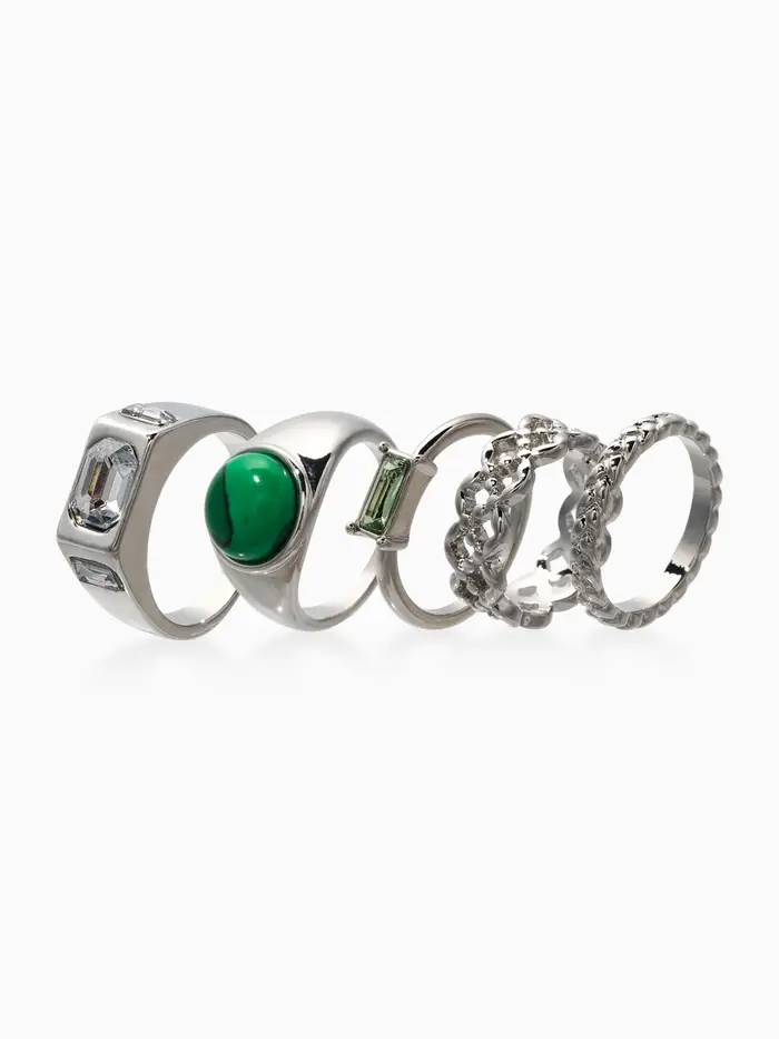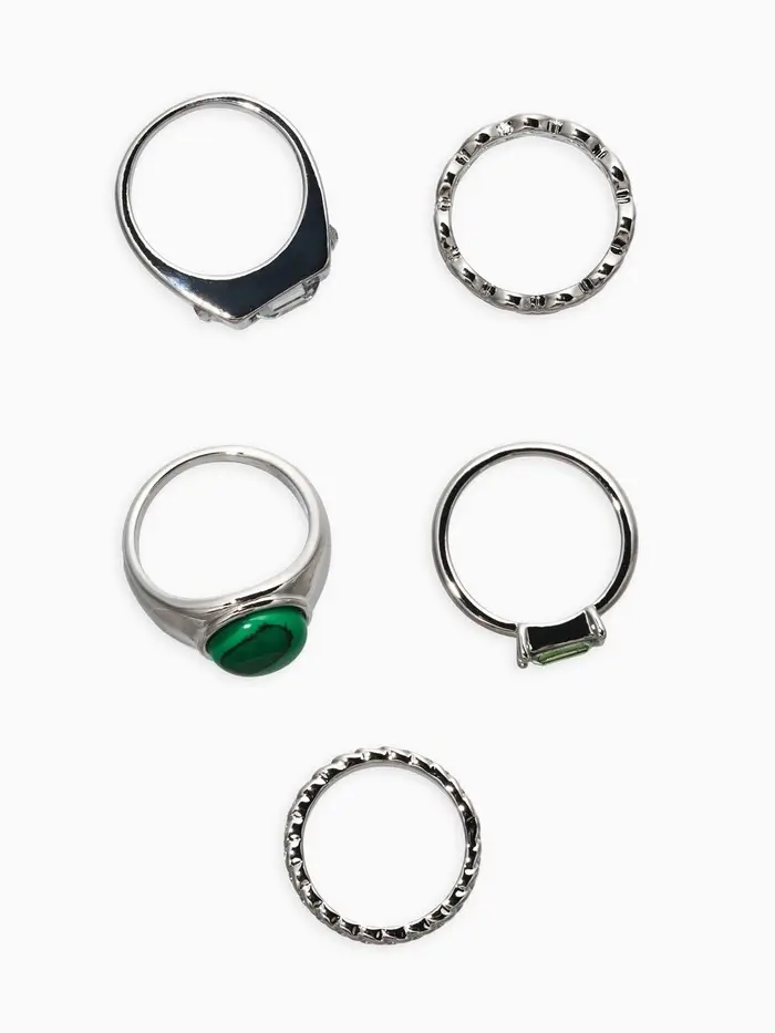 Набор колец 5 шт "Новый стиль" малахит, размер МИКС, цвет изумрудный в серебре