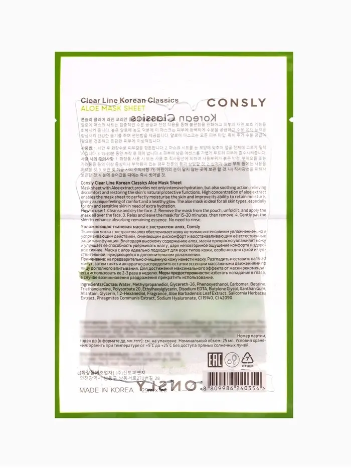 Тканевая маска Consly с экстрактом алоэ разработана для интенсивного увлажнения, успокаивающего ухода и восстановления кожи лица. Маска помогает быстро устранить сухость, чувство стянутости и дискомфорт, оставшиеся после длительного пребывания в сухом воздухе, стрессов или напряжённого дня. Экстракт алоэ выступает ключевым активным компонентом: он глубоко увлажняет кожу, улучшает способность удерживать влагу и способствует восстановлению её естественного барьерного слоя, обеспечивая ощущение комфорта и свежести кожи. Такая маска подходит для всех типов кожи, особенно если кожа склонна к сухости или раздражению.