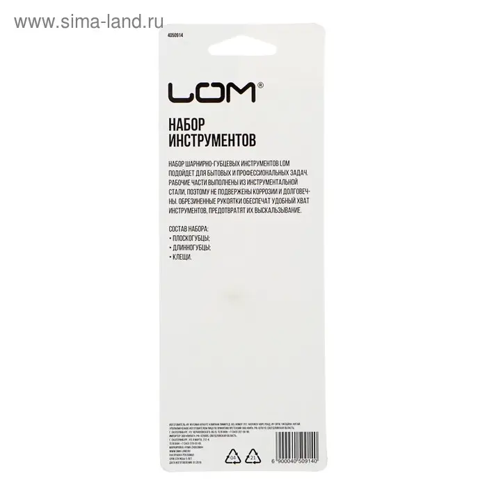 Набор инструментов ЛОМ, бокорезы, длинногубцы, клещи, обрезиненные рукоятки, 80 мм
