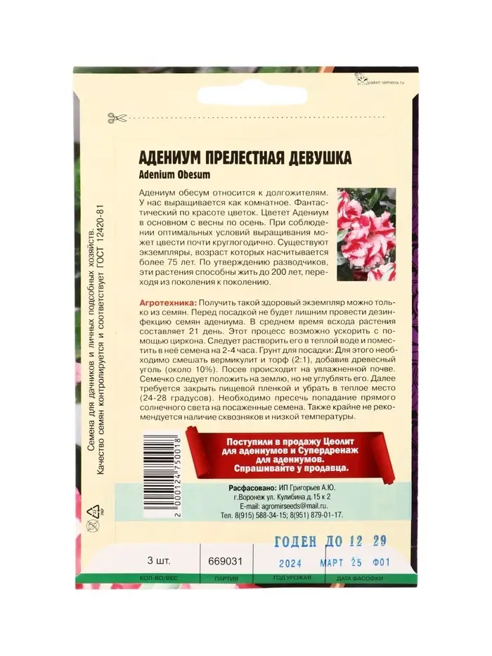 Семена цветов Адениум Прелестная Девушка 3 шт. 12.29 г.