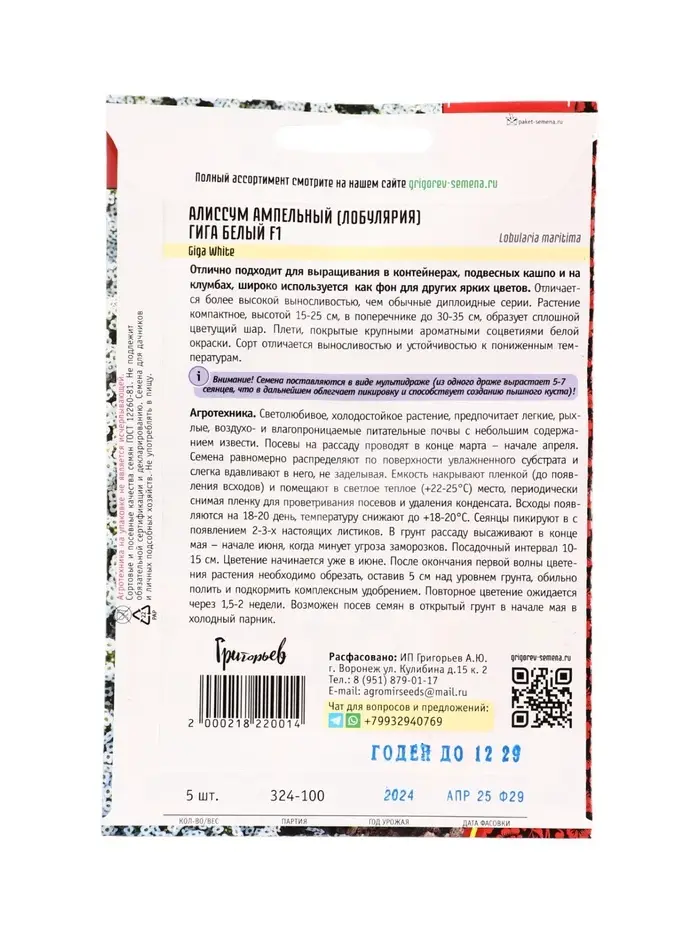 Семена цветов Алиссум Гига Белый (Giga White) 5м.др. 12.29 г.