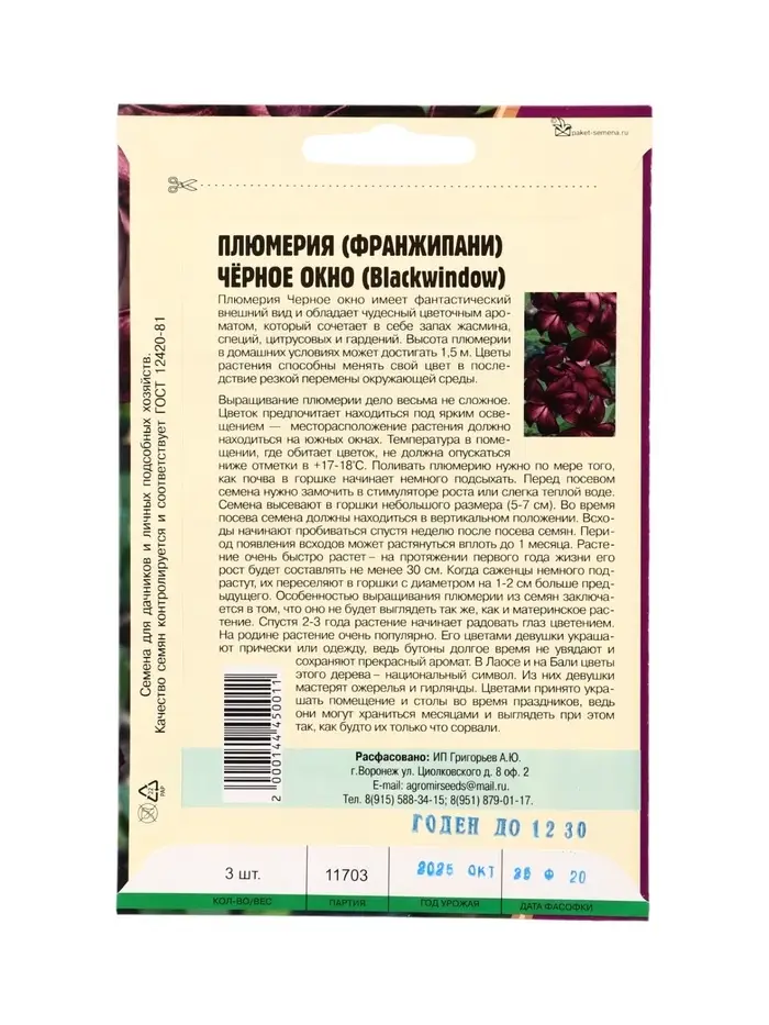 Семена цветов Плюмерия Черное Окно 3 шт. 12.29 г.