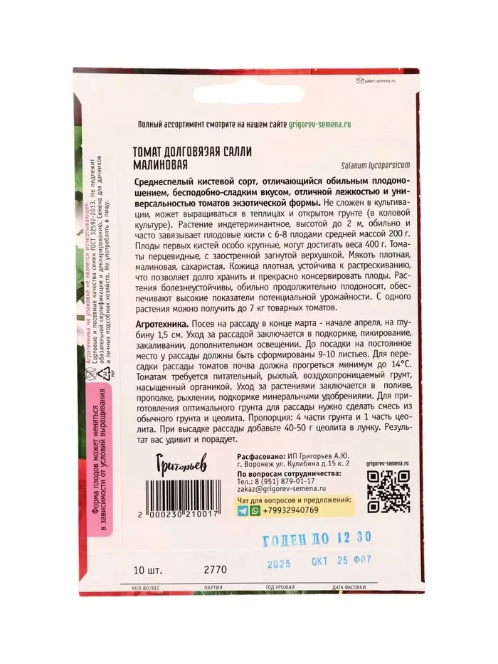 Семена Томат Долговязая Салли Малиновая 10шт. 12.29 г.