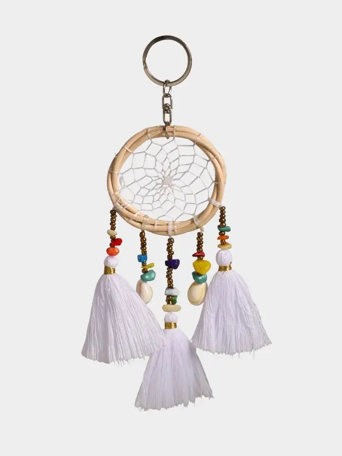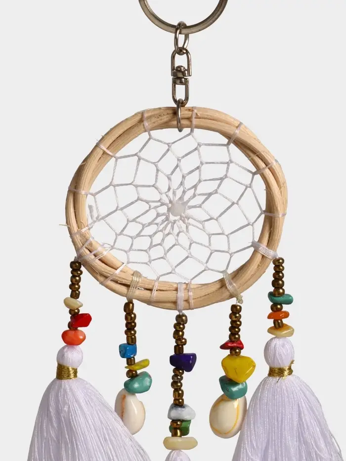 Брелок-ловец снов, 17 см — миниатюрный оберег из хлопка для ключей, рюкзака или сумки. Его белоснежные нити и традиционный узор не только украшают, но и напоминают: даже в суете можно сохранить внутреннее спокойствие. Ловец снов — символ защиты и лёгкости — теперь всегда рядом, куда бы вы ни отправились.