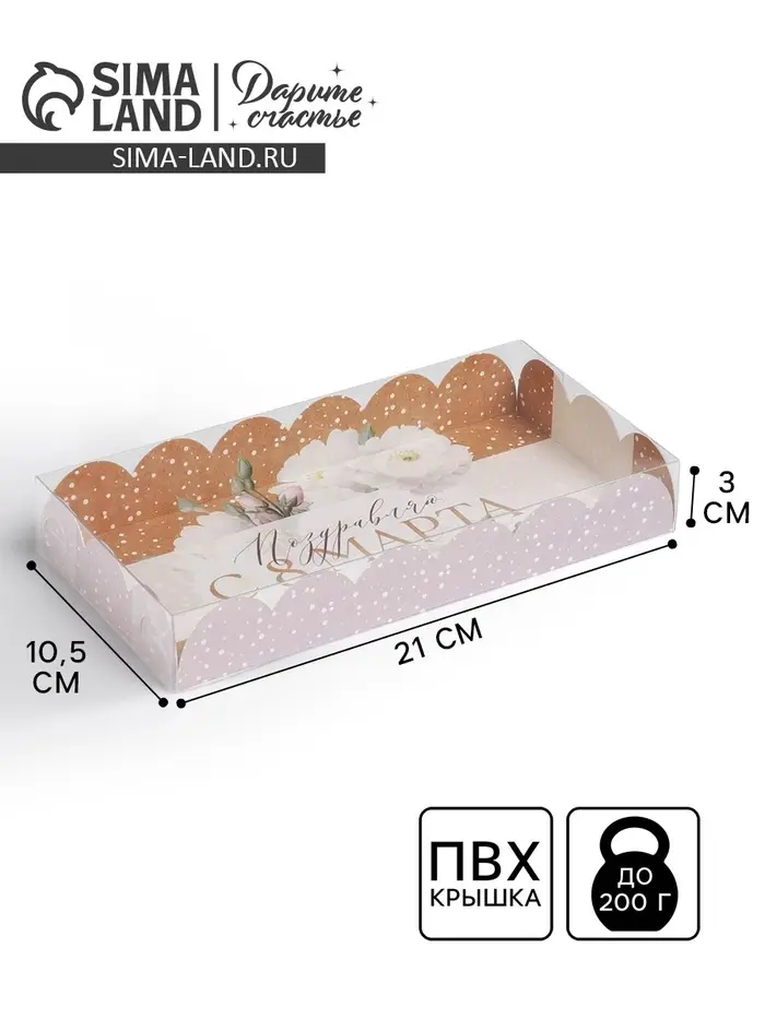 Коробка для печенья, кондитерская упаковка с пластиковой крышкой, «8 марта», 10.5 х 21 х 3 см