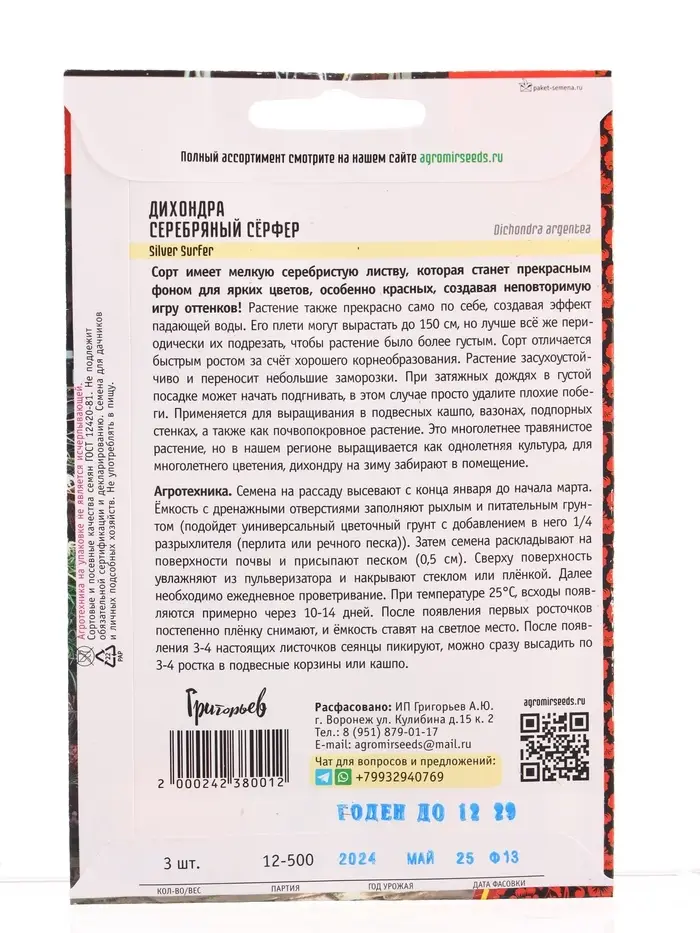 Семена цветов Дихондра Серебряный Сёрфер (Silver Surfer) (Benary) 3шт. 12.29 г.