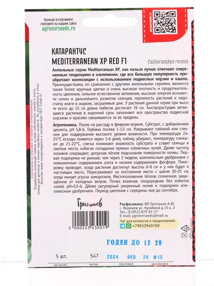 Семена цветов Катарантус Средиземноморский XP Red F1 (Mediterranean) 5шт. 12.29 г.