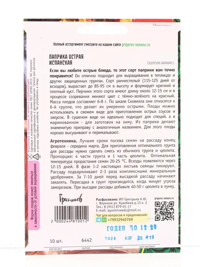 Семена Паприка острая Испанская 10 шт. 12.28 г.