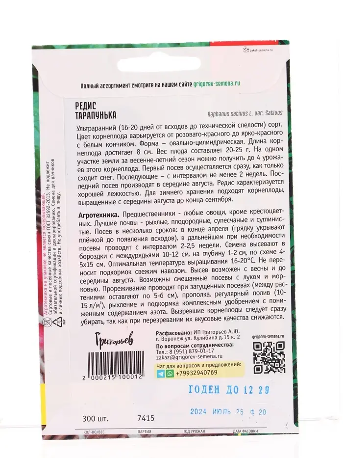 Семена Редис Тарапунька ВП 300шт. 12.29 г.