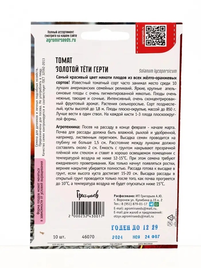 Семена Томат Золотой Тёти Герти 10шт. 12.29 г.