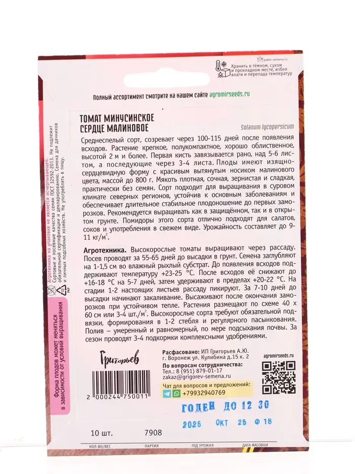Семена Томат Минусинское Сердце Малиновое 10шт. 12.29 г.