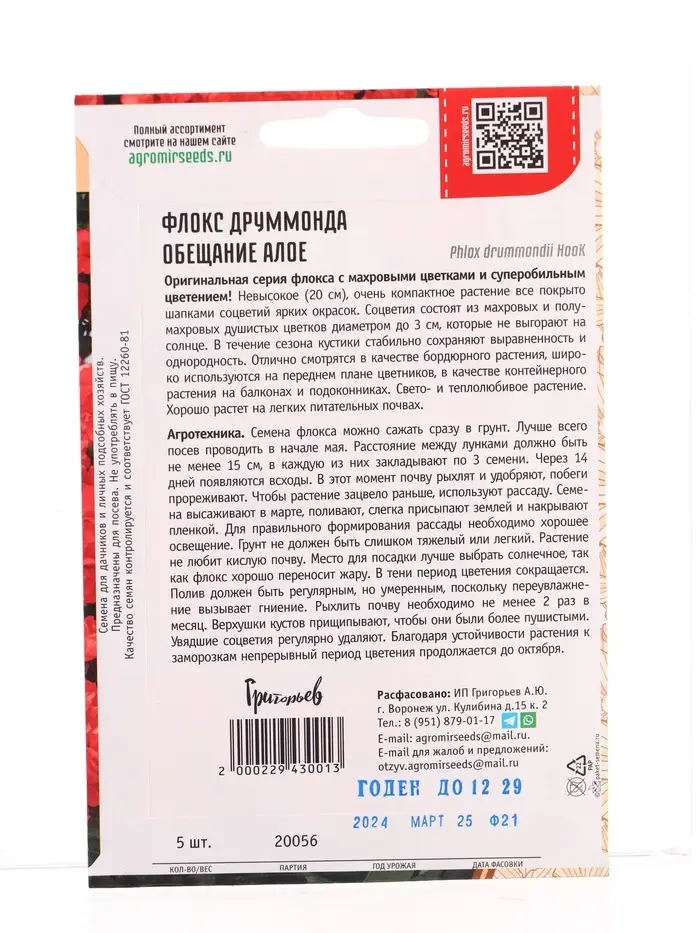 Семена цветов Флокс Обещание Алое махровый 5 шт. 12.29 г.