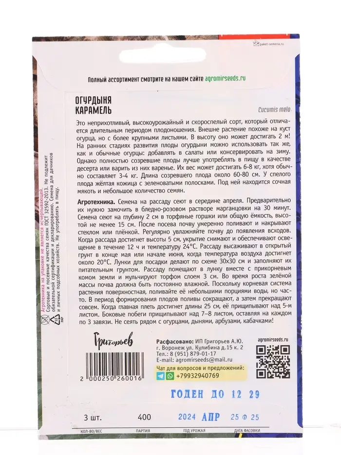 Семена Огурдыня Карамель 3 шт. 12.29 г.