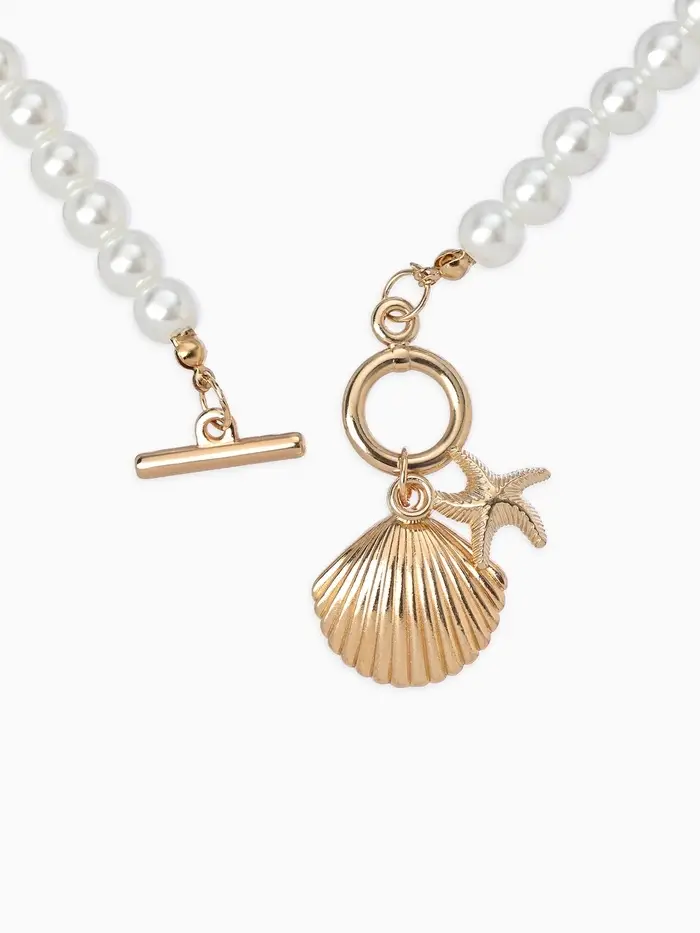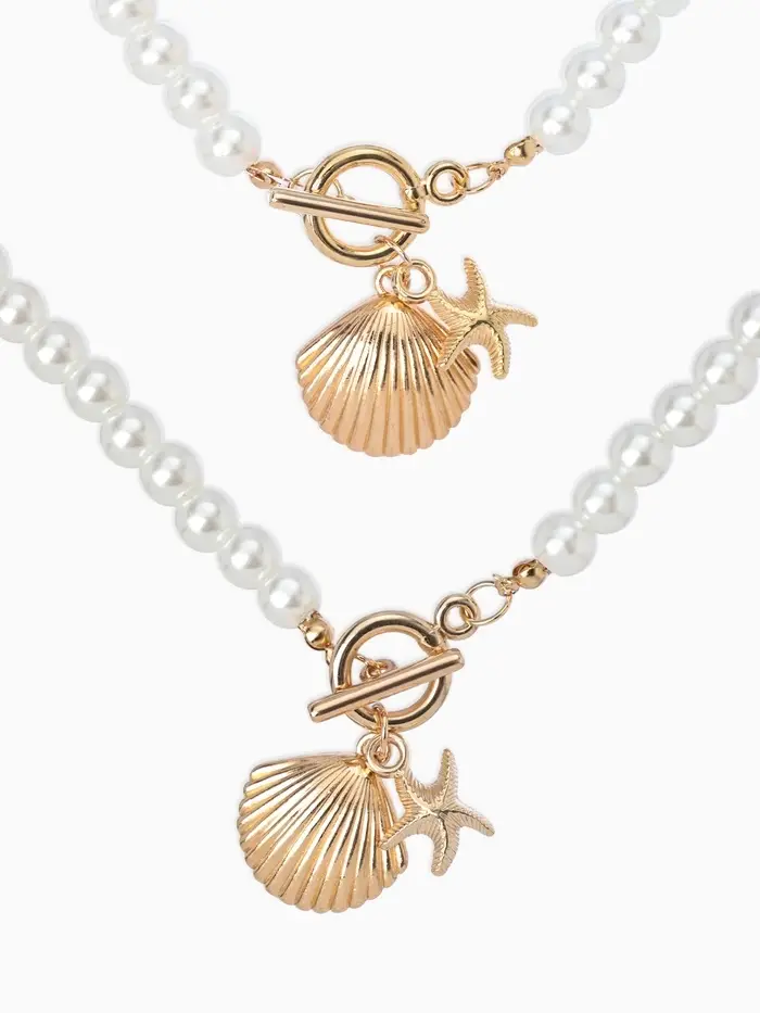 Набор 2 пред-та: бусы.браслет "Жемчуг", ракушка вонголе, цвет белый в золоте L=18/42см №8