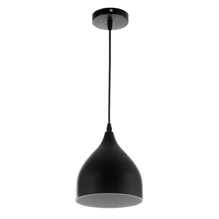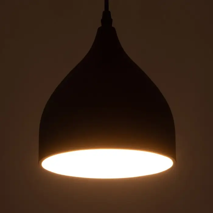 - Дизайн в стиле лофт: Конусный плафон из черного металла повторяет форму капли. Матовое покрытие рассеивает свет мягко, без бликов. Такой светильник становится центральным элементом в гостиной, над обеденным столом или в кафе.