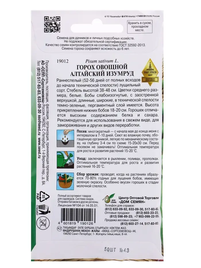 Семена Горох овощной Алтайский Изумруд 50 шт