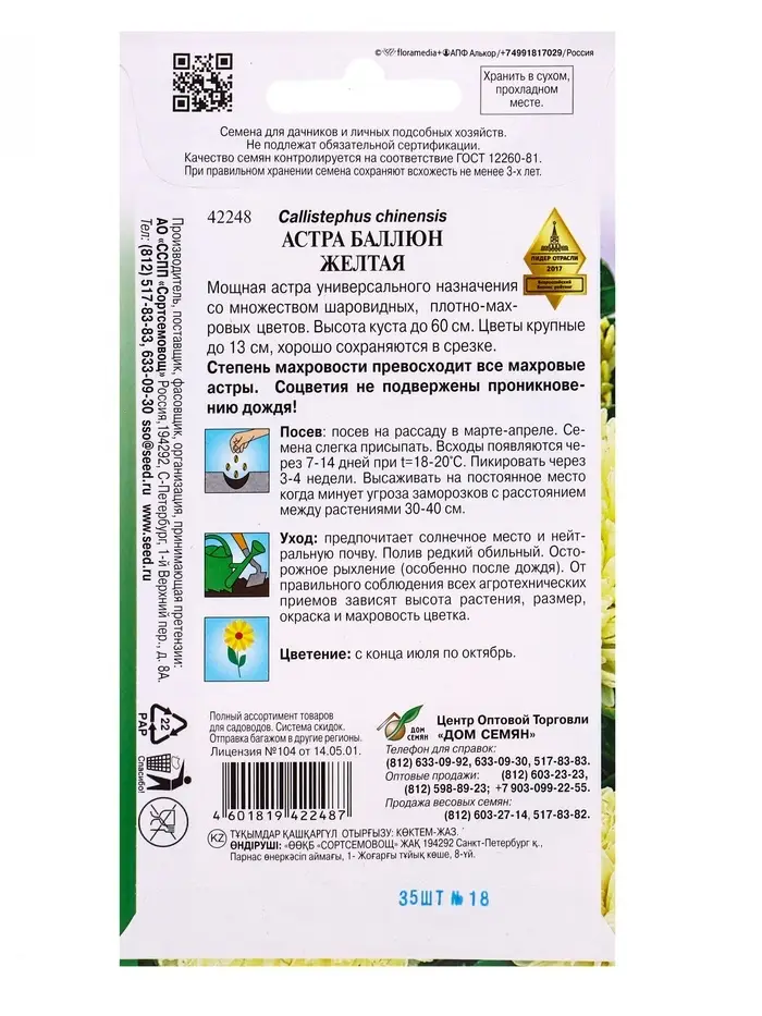Семена цветов Астра Баллюн жёлтая 35 шт