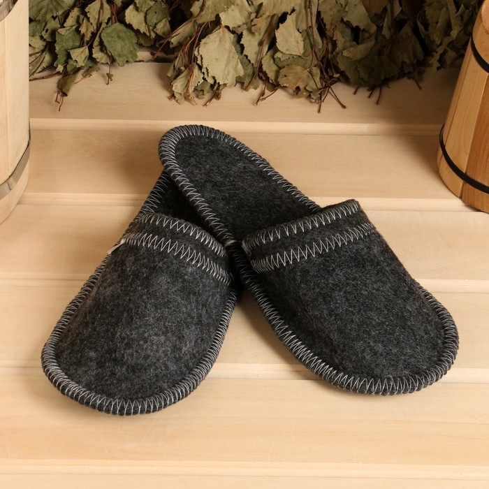 Тапочки из войлока и коврик впитывают влагу и сохраняют сухость, что обеспечивает комфорт во время посещения парной.