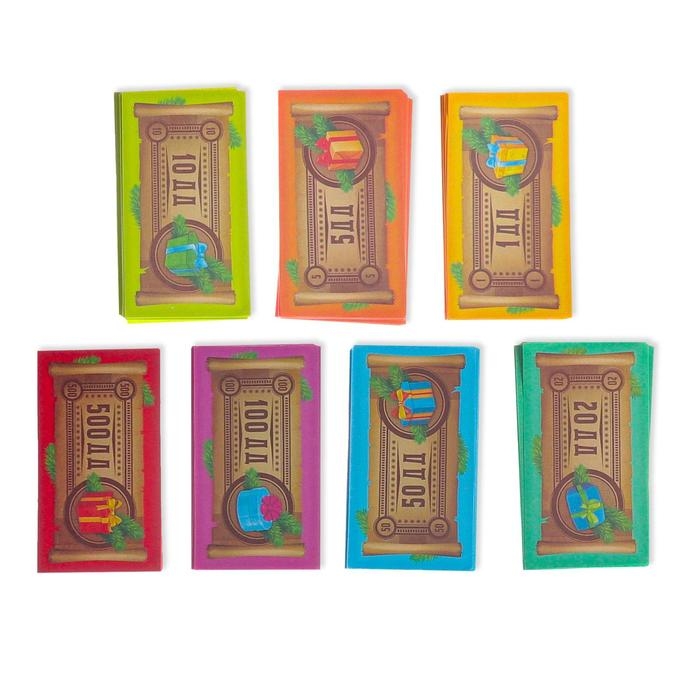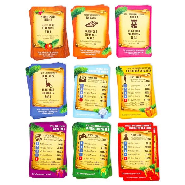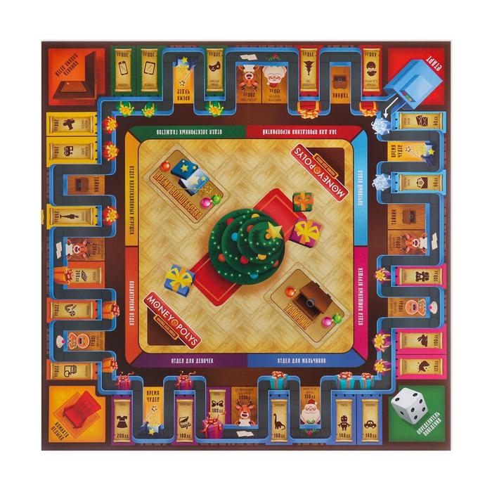 Новогодняя настольная игра «Новый год: MONEY POLYS. Фабрика Деда Мороза», 60 карт, 44 фигурки, 6 фишек, 2 кубика, 10+