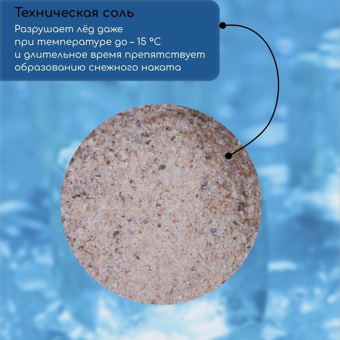 - Техническая соль разрушает лёд при температуре до -15 °С и длительное время препятствует образованию снежного наката.