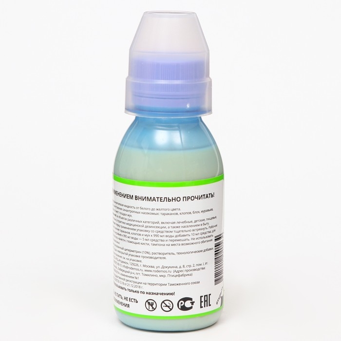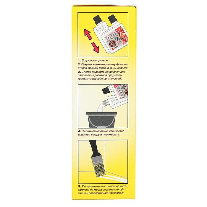 Приготовить рабочий раствор (1 литр): для уничтожения клопов, тараканов и мух - 10 мл средства на 990 мл воды комнатной температуры (при высокой численности - 20 мл на 980 мл воды). Для блох и муравьев - 5 мл на 995 мл воды. Тщательно перемешать, затем нанести на места возможного передвижения и обитания насекомых с помощью опрыскивателя, кисти или тампона.