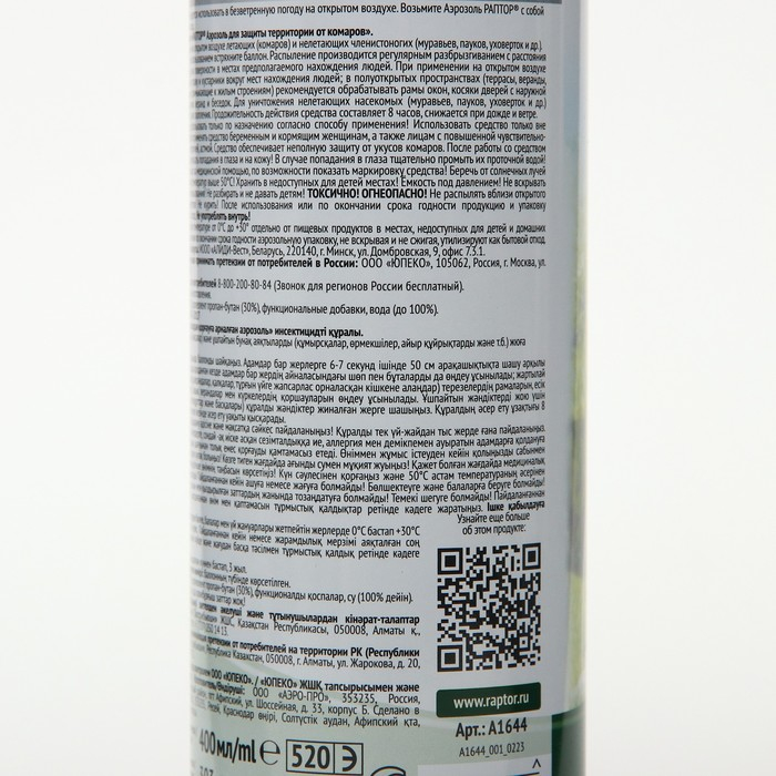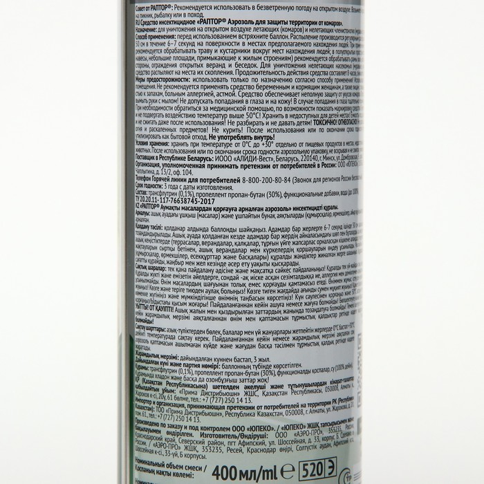 Аэрозоль от комаров "Раптор", 400 мл